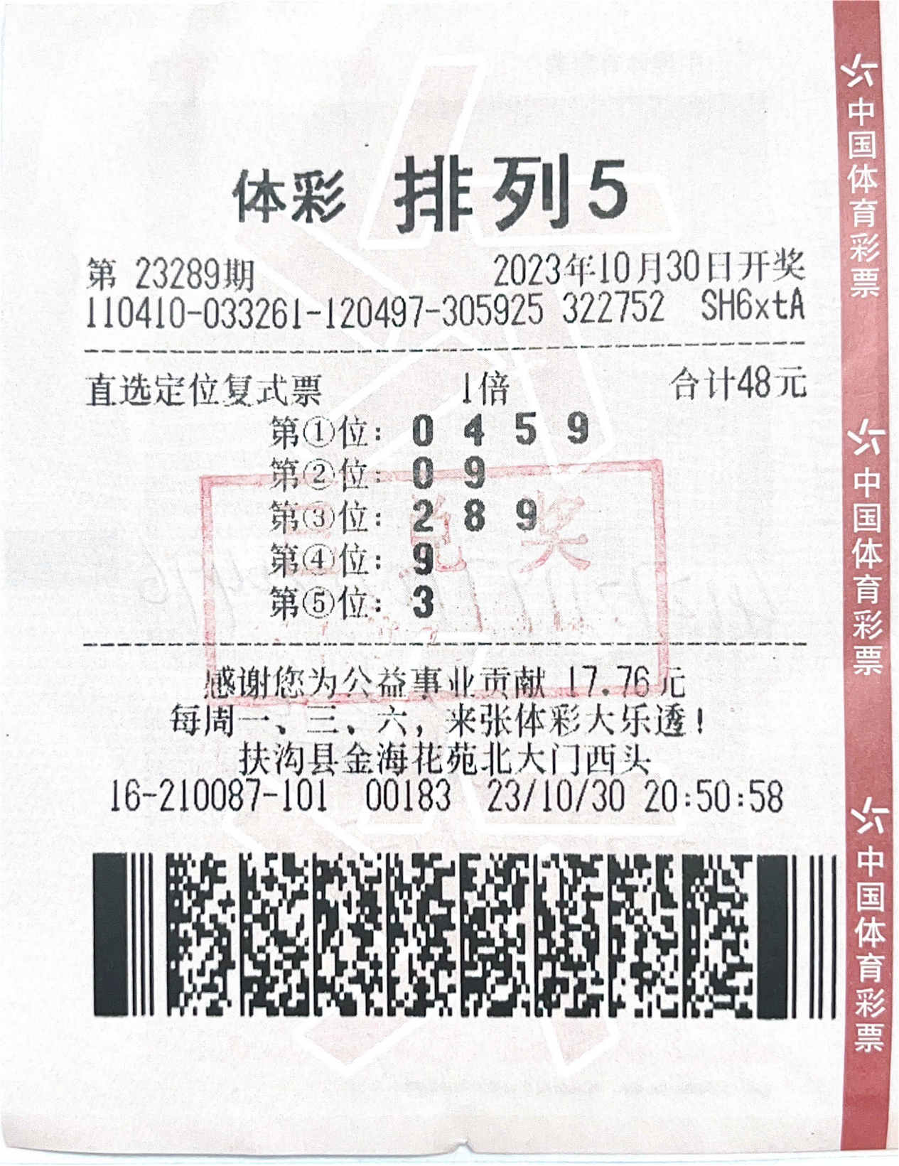 10月30日晚,體彩“排列5”第23289期開獎,開獎號碼為“9、9、8、9、3”。扶溝縣4116210087實(shí)體店喜中“排列5”一等獎1注,獎金10萬元。10月31日,中獎?wù)哧懴壬鷣淼街芸隗w彩分中心兌獎大廳領(lǐng)取了獎金。