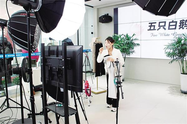 近日,在太康縣返鄉(xiāng)創(chuàng)業(yè)服飾產(chǎn)業(yè)園,一家服裝企業(yè)的工作人員通過(guò)網(wǎng)絡(luò)直播的形式售賣服裝。