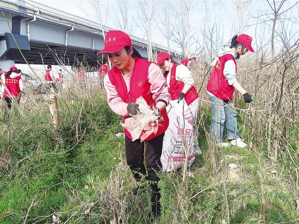 3月22日,志愿者在沙潁河畔撿拾垃圾。當日,67名來自周口市環(huán)境保護協(xié)會、周口師范學院、周口恒大中學的環(huán)保志愿者,在中心城區(qū)沙潁河畔開展“世界水日、中國水周,護河凈灘在行動”活動,以實際行動踐行“綠水青山就是金山銀山”理念。