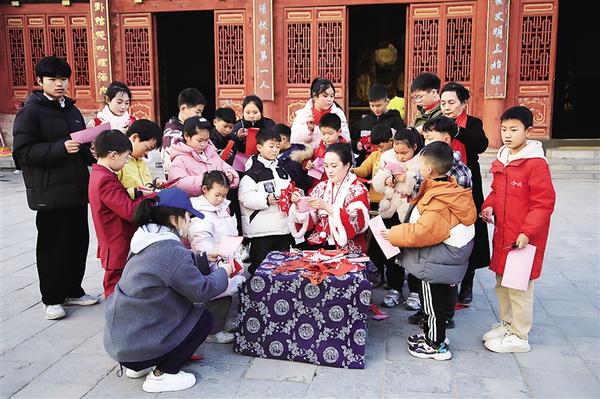 近日,在淮陽太昊陵統(tǒng)天殿前,非遺剪紙傳承人張玉林身著傳統(tǒng)服裝,帶領孩子們一起剪紙。