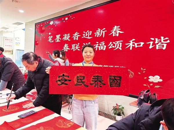 1月20日,扶溝縣政務服務中心一名工作人員展示剛收到的手寫春聯。連日來,我市數千余名書法家、書法愛好者為市民寫春聯、送“?!弊?,送上美好的祝福。