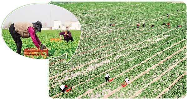 近年來,我市積極推廣“合作社+農(nóng)戶”“家庭農(nóng)場+農(nóng)戶”經(jīng)營模式,鼓勵農(nóng)民通過土地流轉(zhuǎn)將分散耕地整合起來,實(shí)現(xiàn)集中化、規(guī)?;?jīng)營,全力提高土地利用效率,為鄉(xiāng)村振興注入強(qiáng)勁動力。圖為4月11日,在淮陽區(qū)王店街道范莊行政村的農(nóng)田里,村民正采收蔬菜。