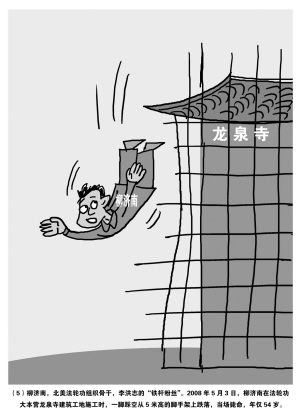 ?、?nbsp;柳濟(jì)南,北美法輪功組織骨干,李洪志的鐵桿粉絲。2008年5月3日,柳濟(jì)南在法輪功大本營龍泉寺建筑工地施工時(shí),一腳踏空從5米高的腳手架上跌落,當(dāng)場斃命,年僅54歲。(漫畫作者 星雨)