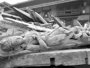 4月26日,在尼泊爾帕坦,杜巴廣場佛像倒塌、一片狼藉。新華社發(fā)