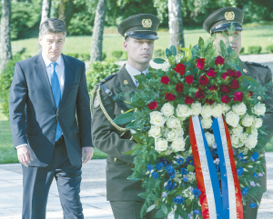 ?、?月9日,在克羅地亞首都薩格勒布,克總理米拉諾維奇(左)在紀(jì)念反法西斯戰(zhàn)爭勝利70周年的活動中向人民英雄紀(jì)念碑敬獻(xiàn)花圈。新華社發(fā)