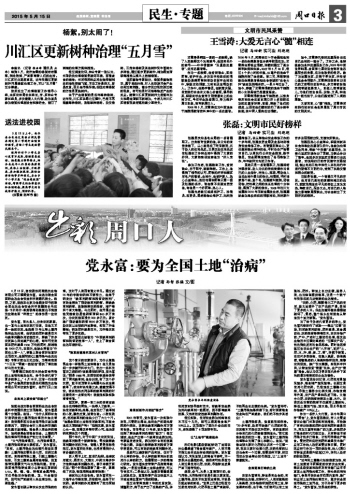 黨永富, 商水縣人,出身農(nóng)民家庭,也一直與土地和農(nóng)民打交道,但他又不是一般的農(nóng)民。他連續(xù)23年從事土壤污染和生態(tài)治理,他研發(fā)的肥料減量技術與除草劑副作用防控技術,解除了許多農(nóng)民擔心田地減產(chǎn)的心病,每年可使我國在肥料減量1950萬噸的同時,新增糧食1000億斤。在國內(nèi),他被業(yè)界譽為”中國治土第一人”,曾登上聯(lián)合國講壇宣講此項技術。他撰寫的《土壤污染與生態(tài)治理》專著日前也正式出版,為落實我國“十三五”“兩減一控規(guī)劃”提供了理論教材與技術支撐。