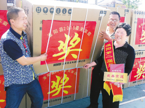 左圖  5月19日,淮陽縣隆重表彰63戶2015年度“最美家庭”。近年來,該縣依托“婦女之家”,通過召開座談會、講親情故事、曬照片等形式,大力開展尋找“最美家庭”活動,取得了良好的社會效果。圖為當選“最美家庭”的齊國蘭高興地領取獎品。