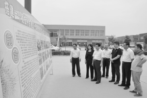 縣領(lǐng)導(dǎo)在雷爍光電廠區(qū)參觀首屆職工技能運(yùn)動會展板。