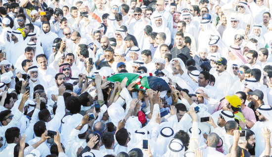 科威特民眾悼念清真寺爆炸事件遇難者 6月27日,民眾在科威特北部蘇萊伊哈特陵園參加活動(dòng),悼念伊瑪目薩迪克清真寺爆炸事件的遇難者??仆?cái)?shù)千名民眾27日在科北部蘇萊伊哈特陵園悼念伊瑪目薩迪克清真寺爆炸事件的遇難者。